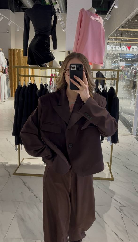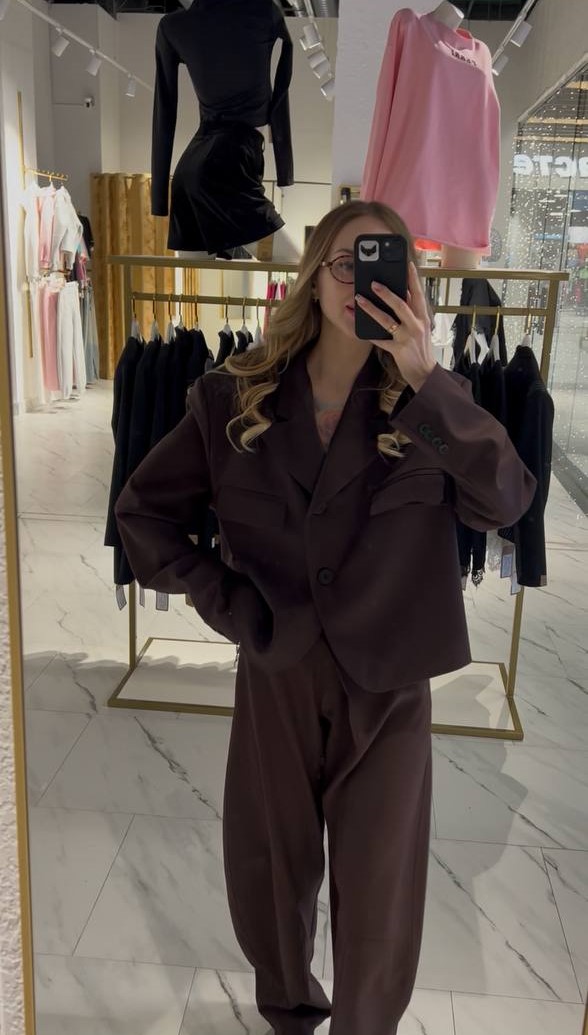Современный укороченный жакет в шоколадном цвете — идеальный вариант для тех, кто ценит стиль и универсальность. Модель выполнена из плотной костюмной ткани высокого качества, не мнется и отлично держит форму. Носите с классическими брюками для офиса, с джинсами и футболкой для городской прогулки или поверх платьев для вечернего выхода — жакет легко адаптируется под любой гардероб.