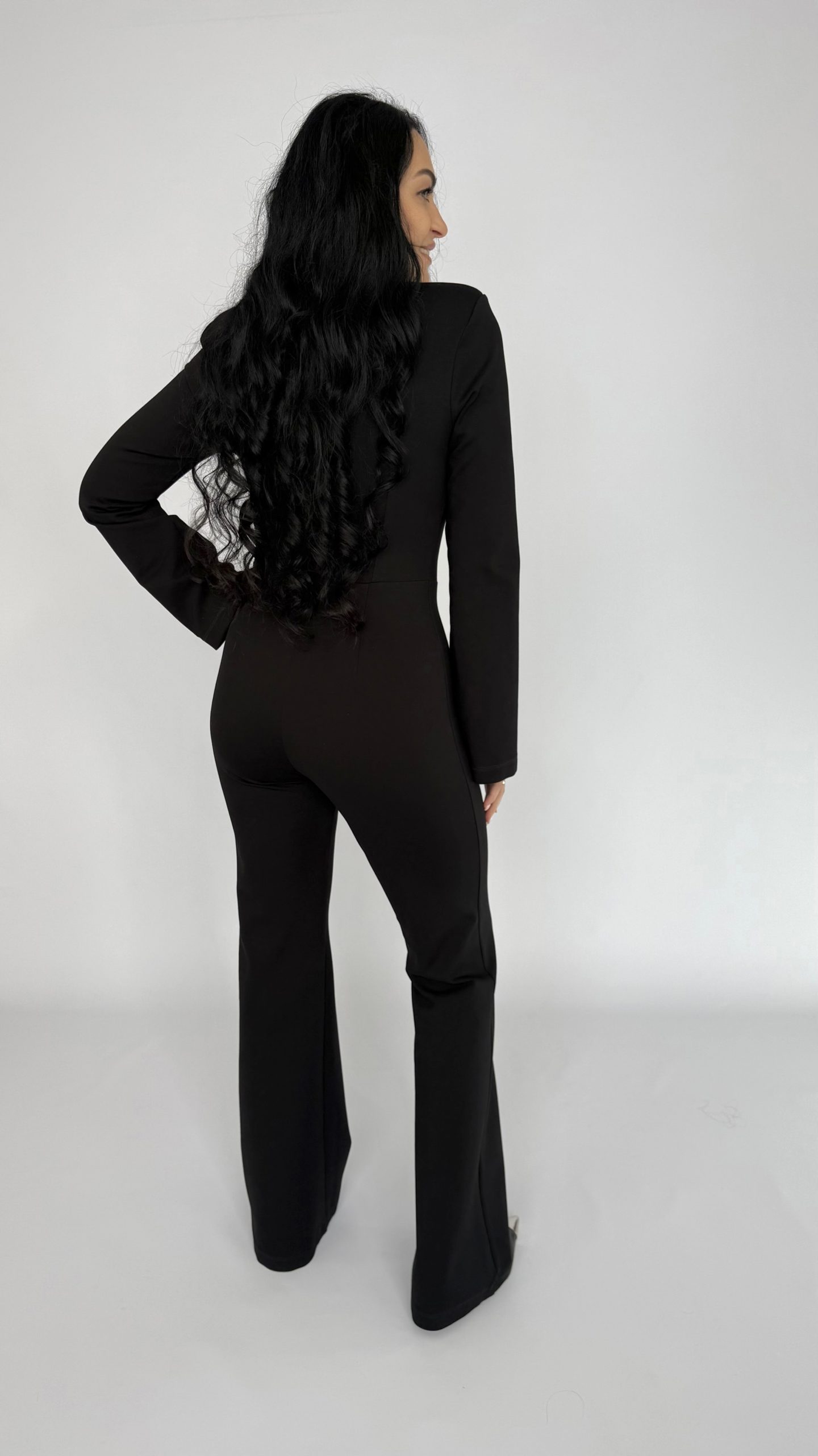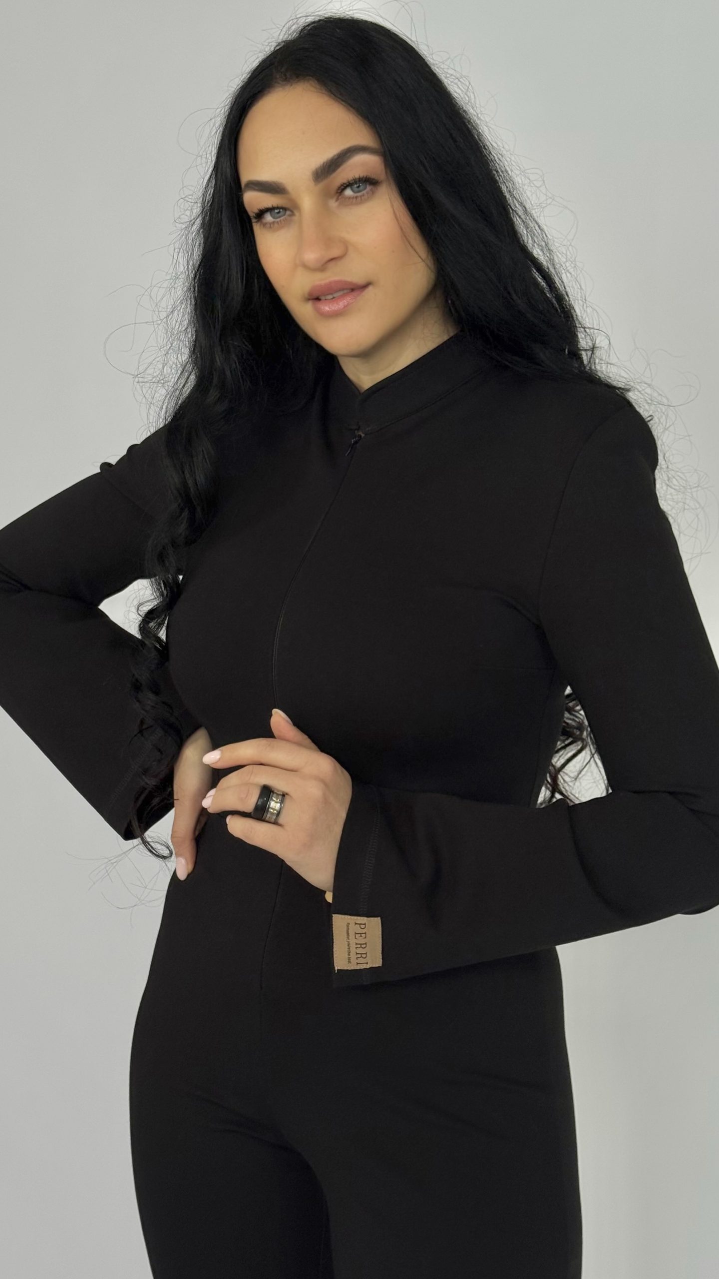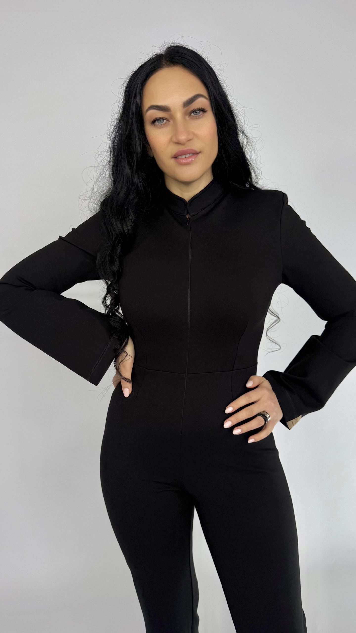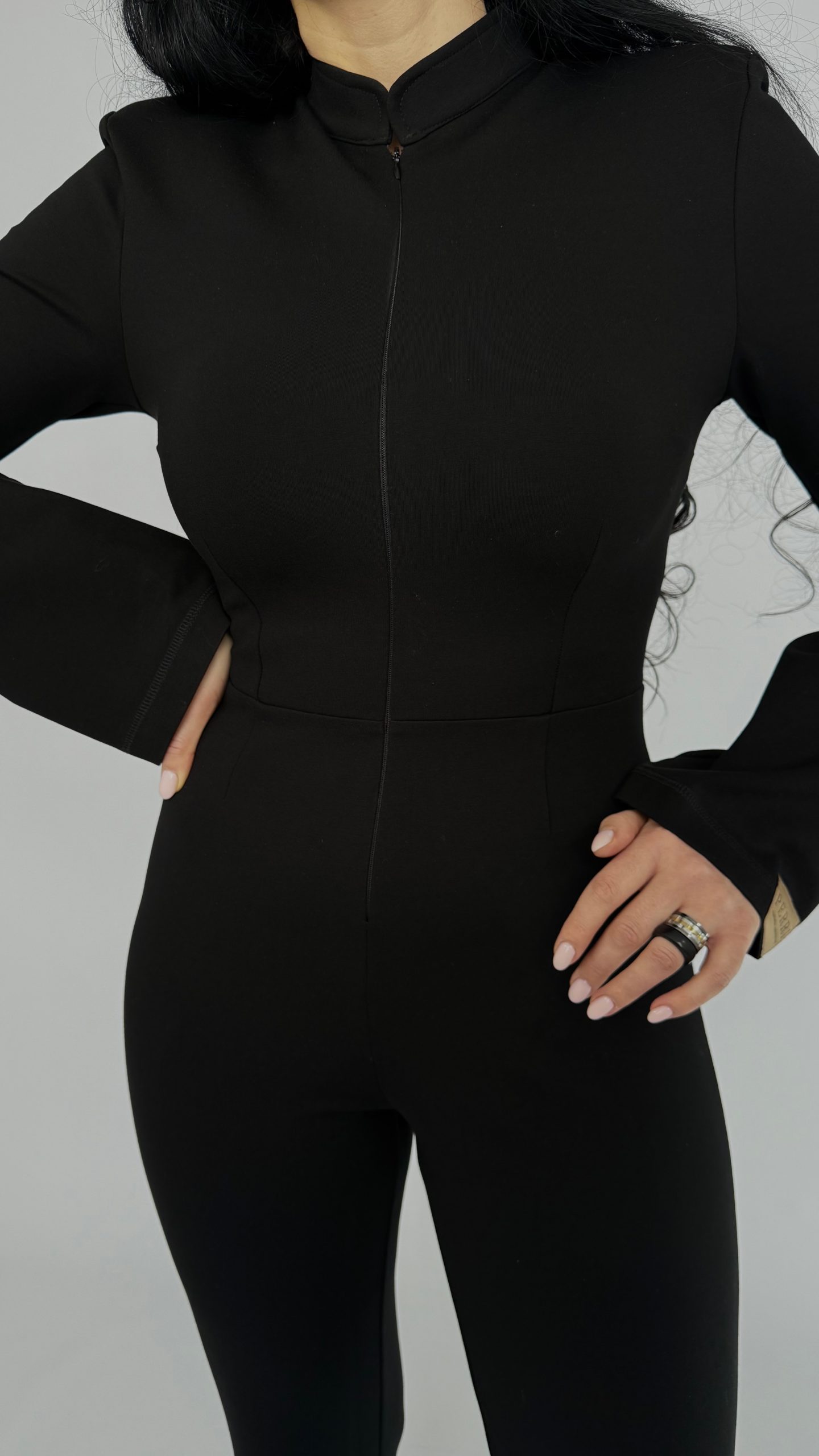Элегантный черный комбинезон «Capsule»— универсальная база гардероба, которая подчёркивает силуэт и придаёт образу лоск. Модель из плотного эластичного трикотажа садится по фигуре, визуально удлиняет ноги за счёт слегка расклёшенных брюк и высокой посадки талии. Строгая стойка воротника и аккуратная потайная застёжка спереди создают минималистичный, современный силуэт — идеален и для офиса, и для вечера.