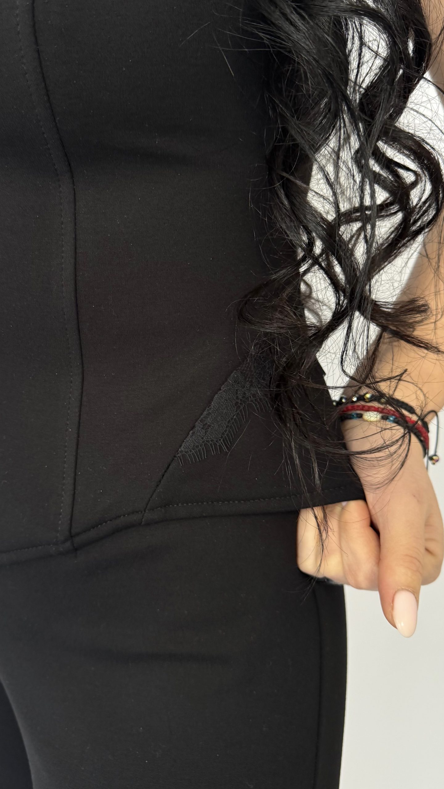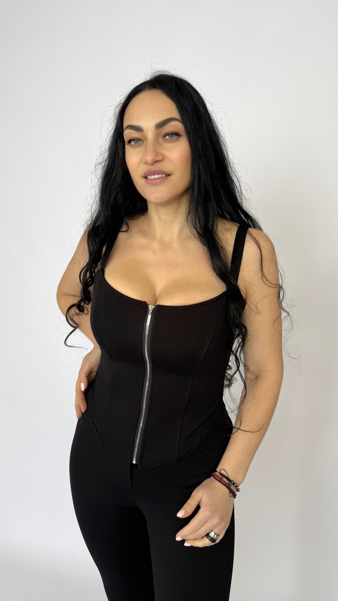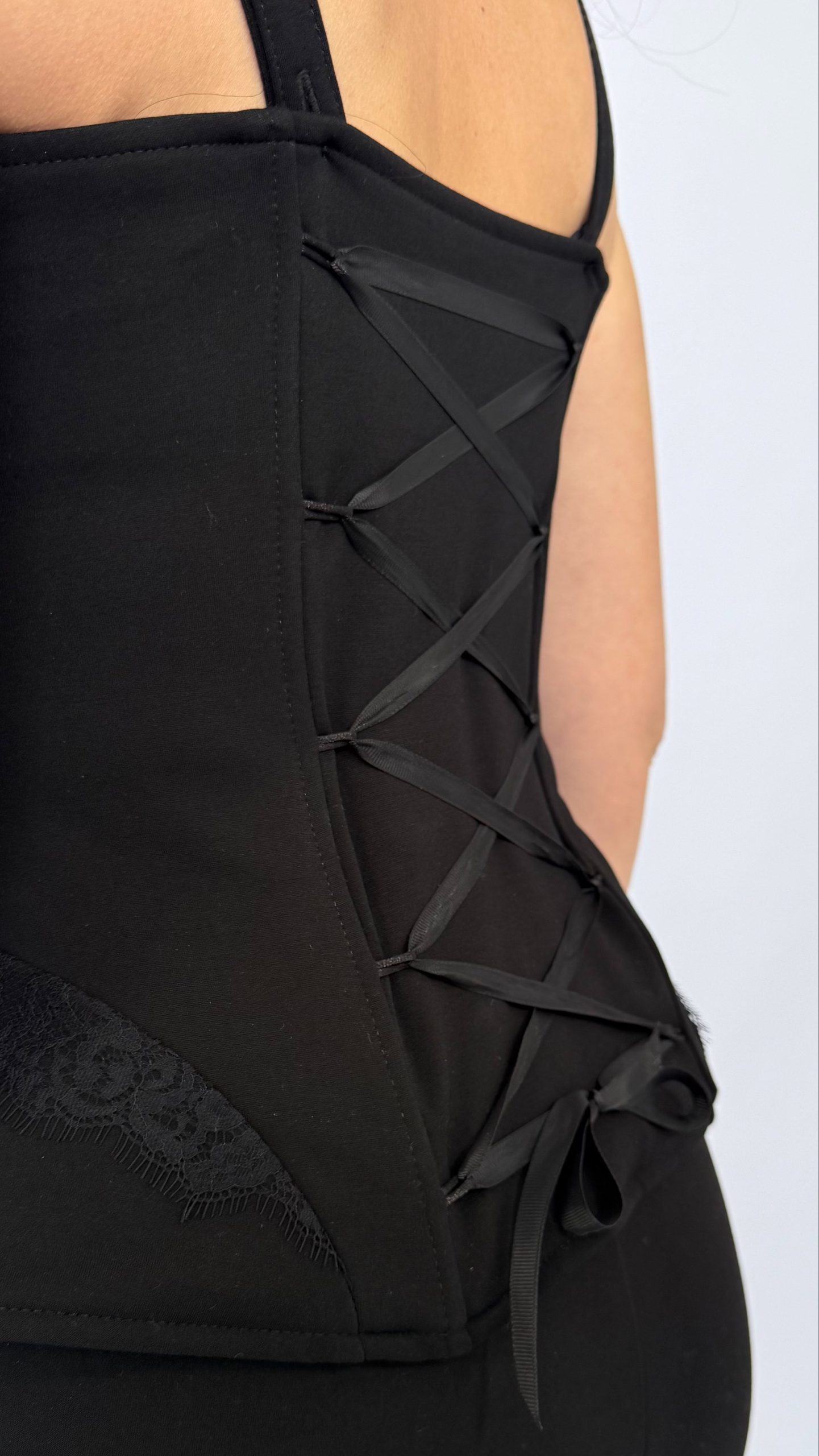 Идеальный корсет для тех, кто ценит элегантность и удобство. Стильный и универсальный элемент гардероба, который подчеркнёт талию. Черный матовый материал, аккуратная кружевная отделка по бокам и регулируемая шнуровка создают слаженный силуэт и придают образу женственности. Узкие бретели и аккуратный вырез выгодно подчёркивают декольте, сохраняя элегантность.