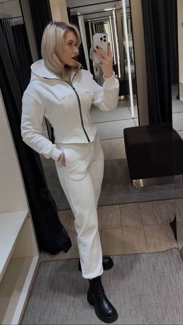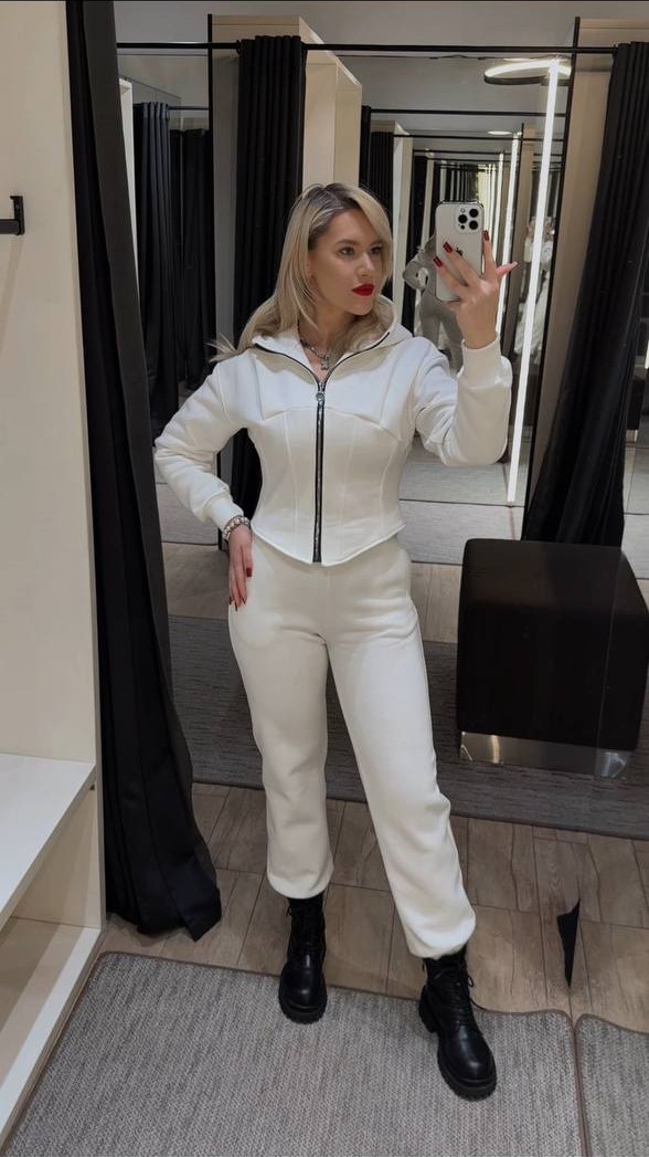 Современный костюм— идеальный баланс уюта и городской элегантности. Верх с молнией выполнен в крое, моделирующем талию — лёгкий корсетный эффект подчёркивает силуэт, а продуманная посадка не сковывает движений. Брюки — комфортные джоггеры с зауженным низом и вшитыми боковыми карманами: практично для прогулок и стильных образов.