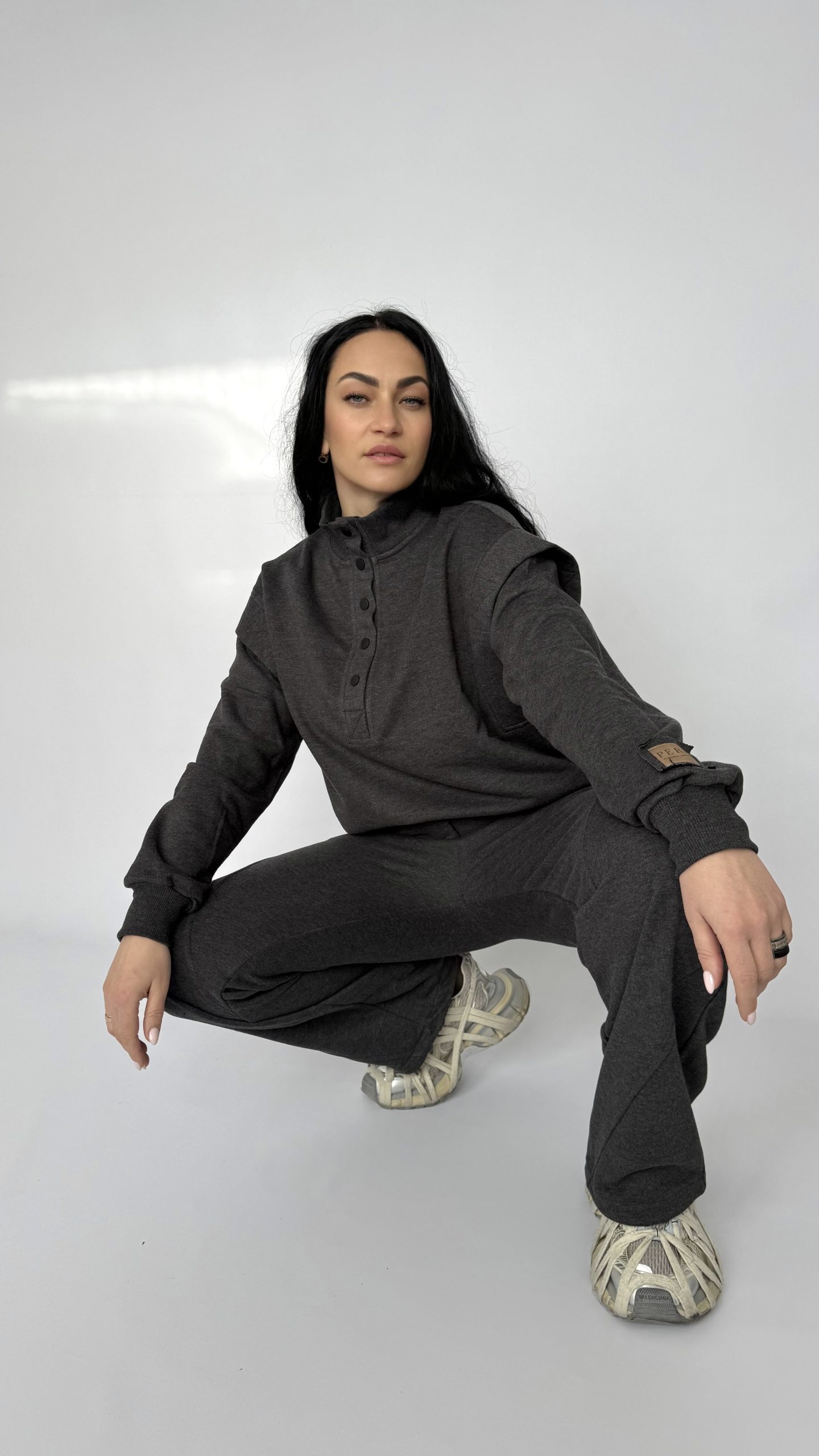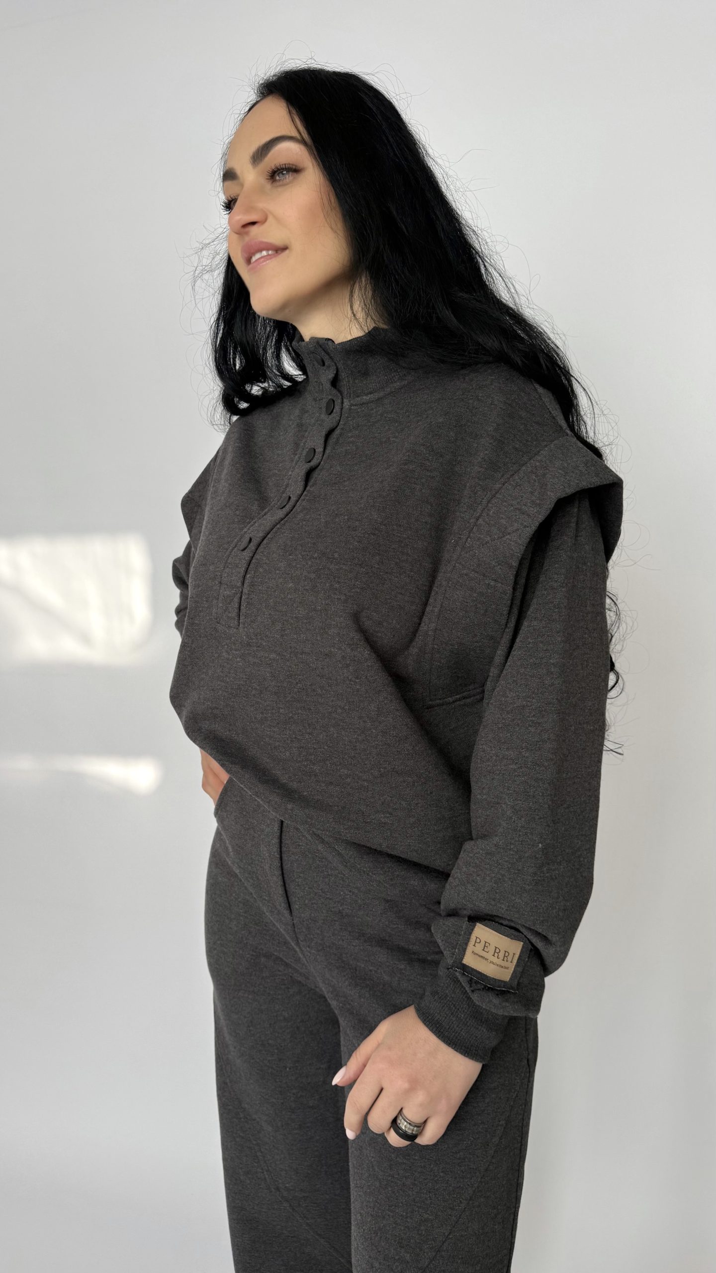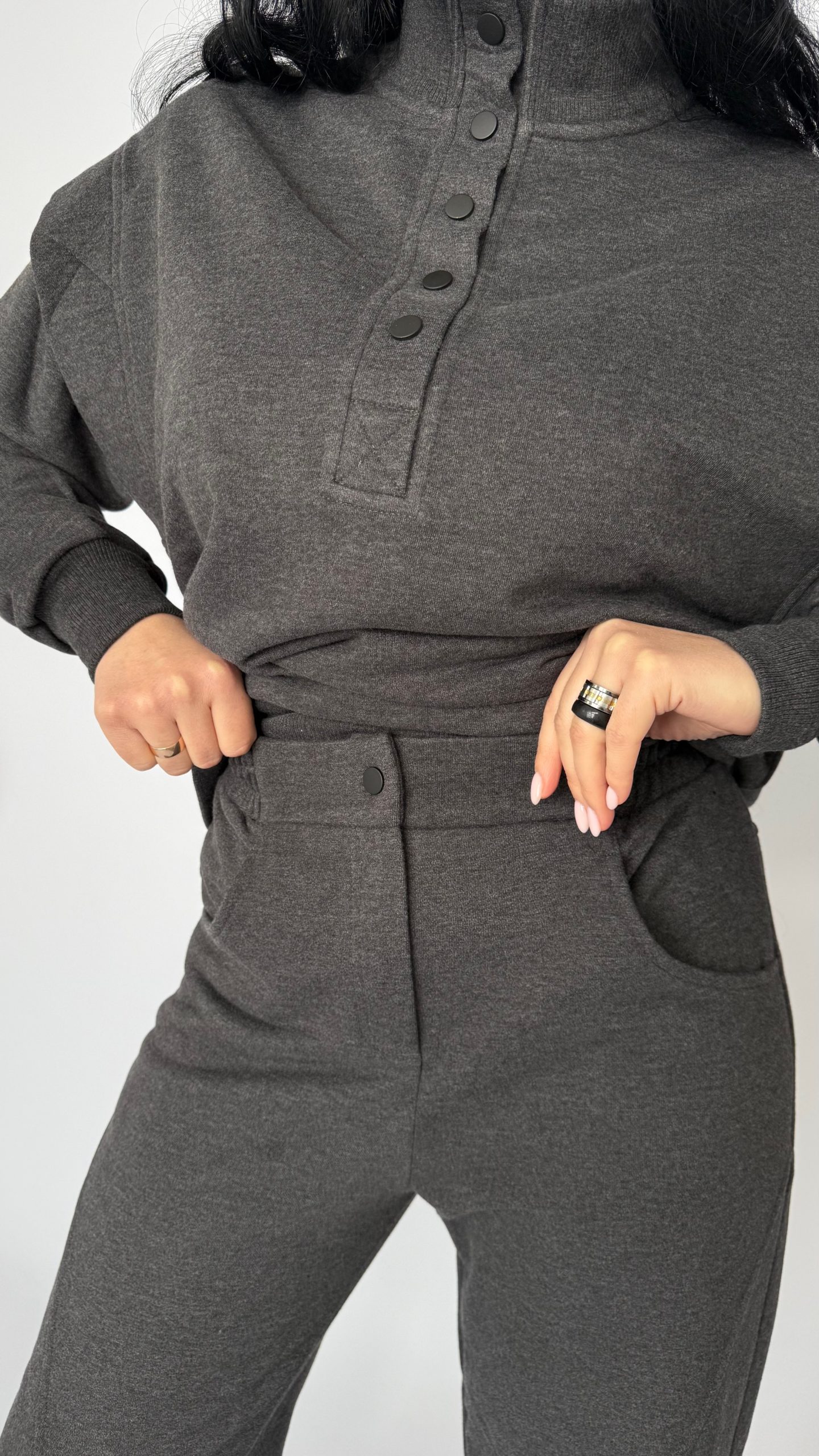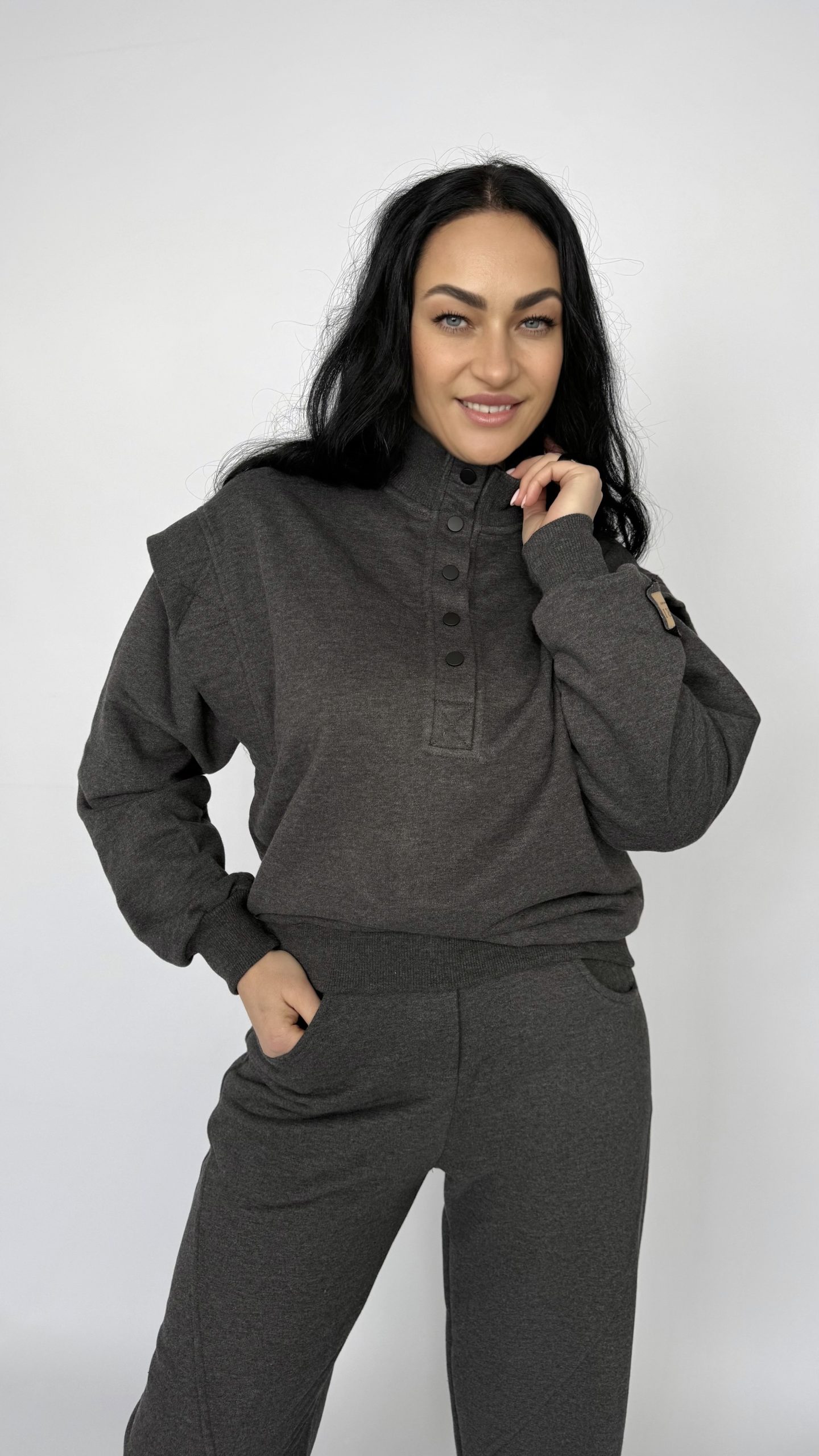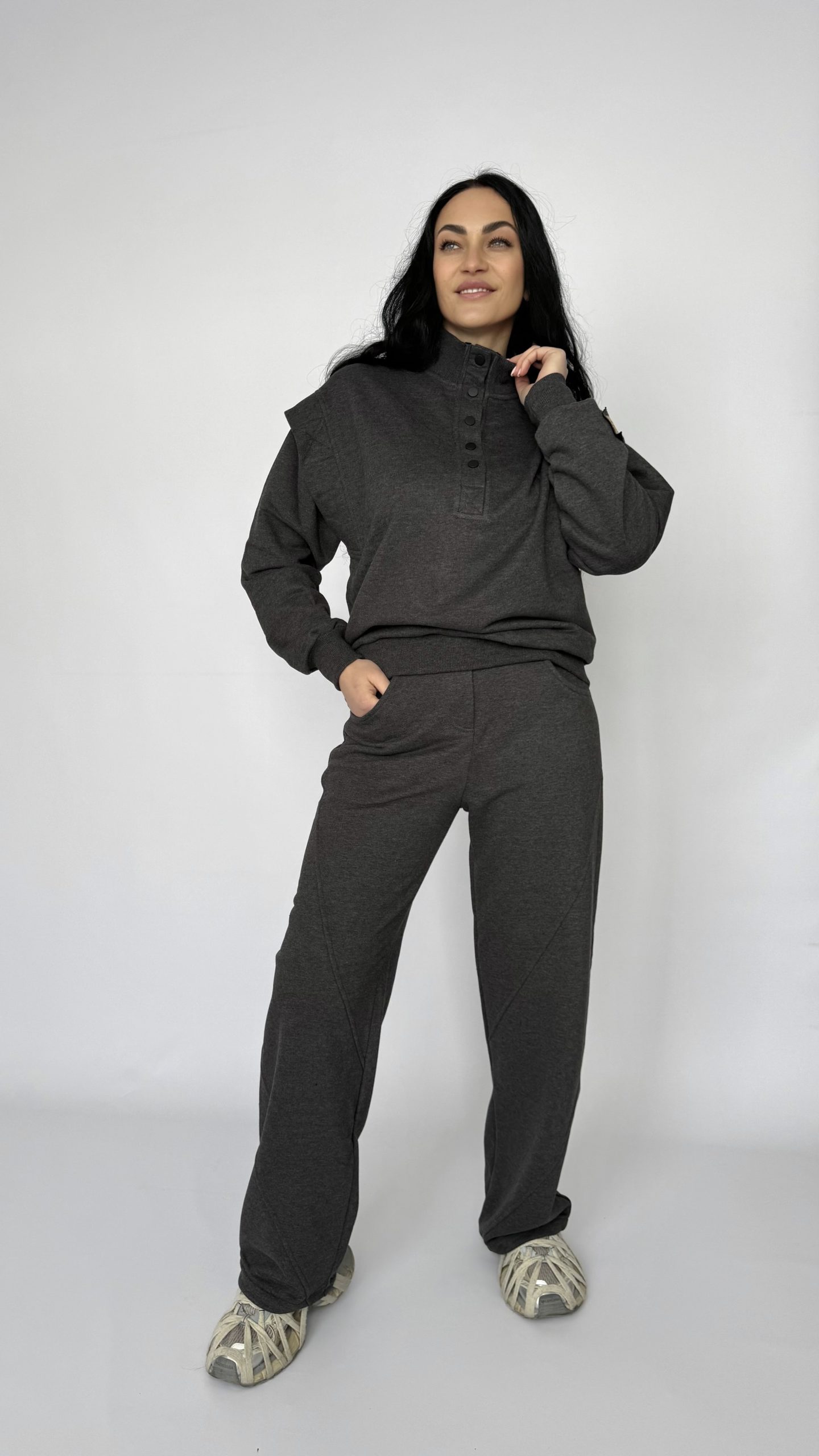 Современный костюм «Illusion»— идеальный выбор для тех, кто ценит комфорт и стиль в повседневной жизни. Выполнен из мягкого плотного трикотажа, который сохраняет тепло и форму, но при этом дышит и не сковывает движений. Свободный, ненавязчивый силуэт — подходит для прогулок и поездок. Высокий воротник на пуговицах — добавляет выразительности и позволяет регулировать тепло. Эластичная талия и удобные карманы — практично и комфортно каждый день. Аккуратные декоративные швы на брюках создают современный, лаконичный акцент. Универсальный цвет мокрого асфальта легко комбинируется с обувью и аксессуарами.