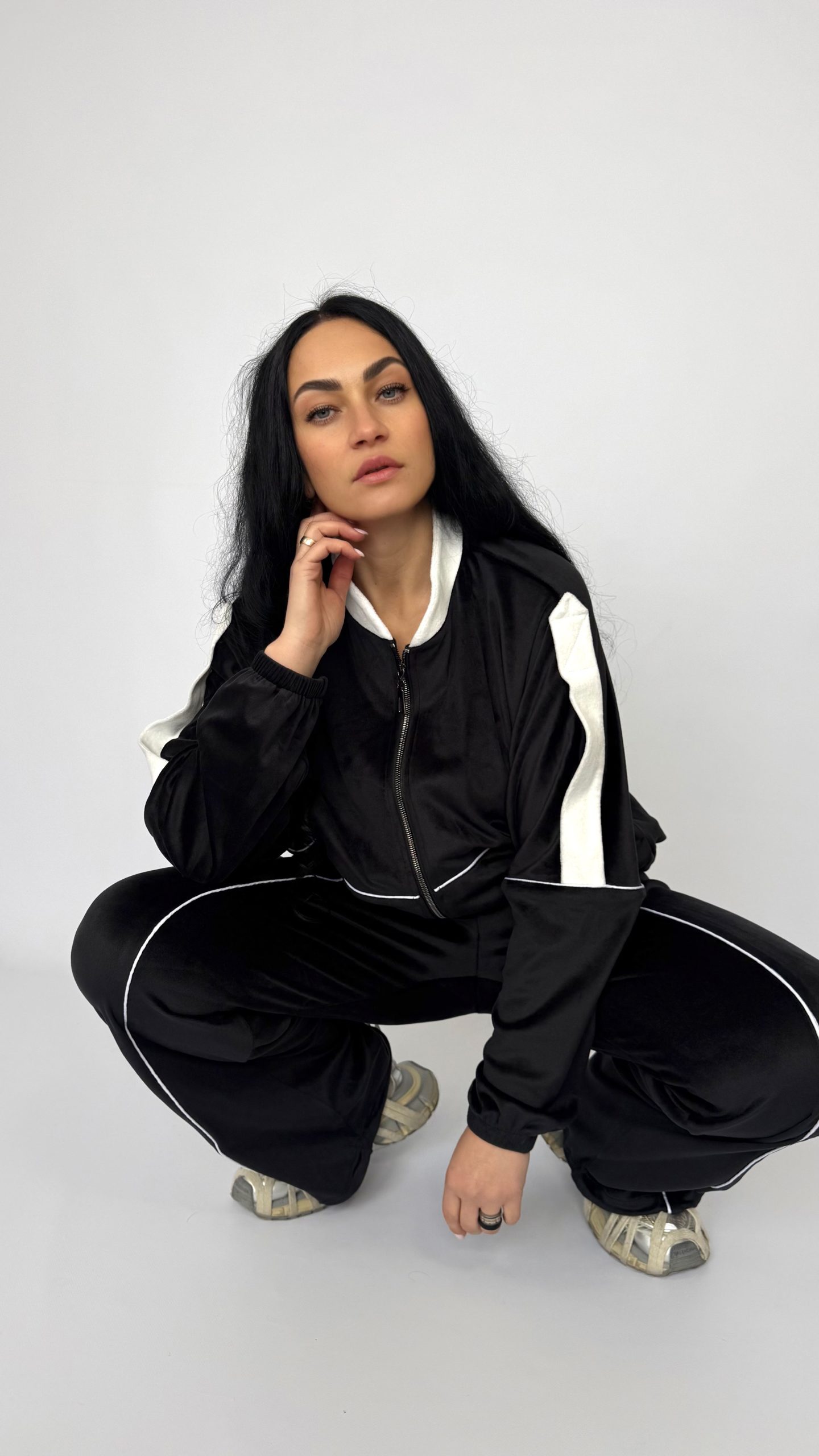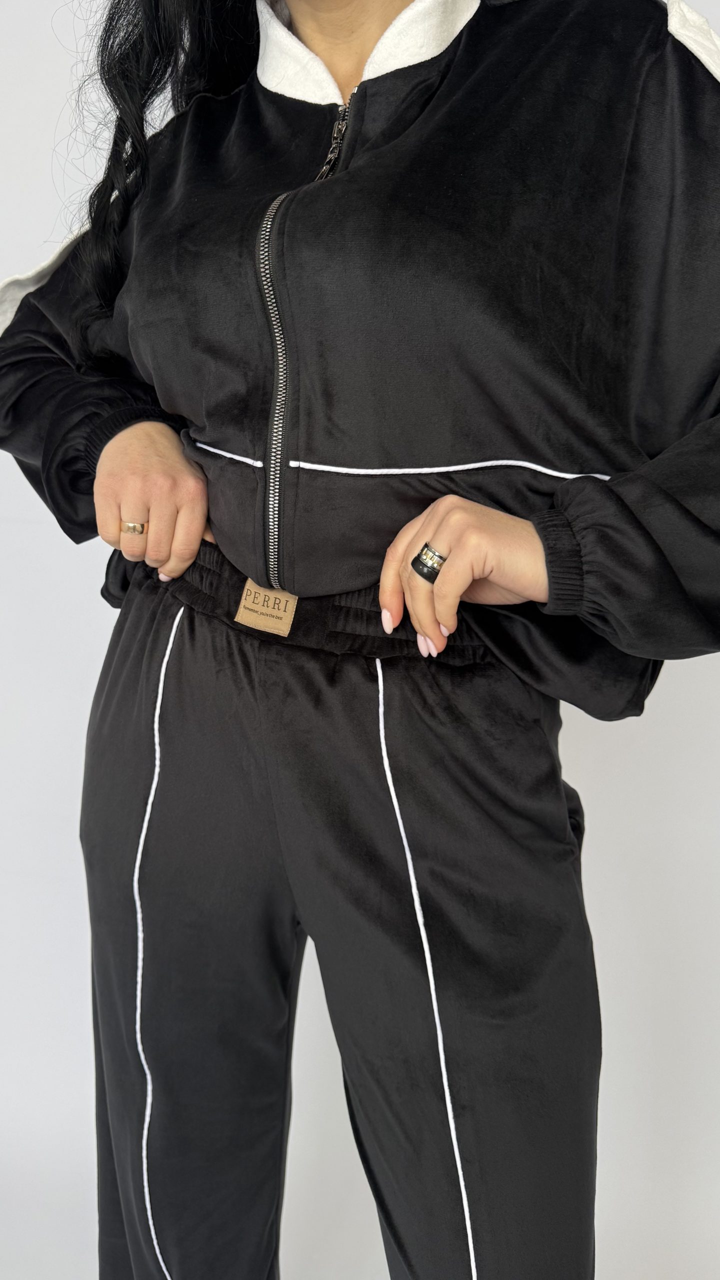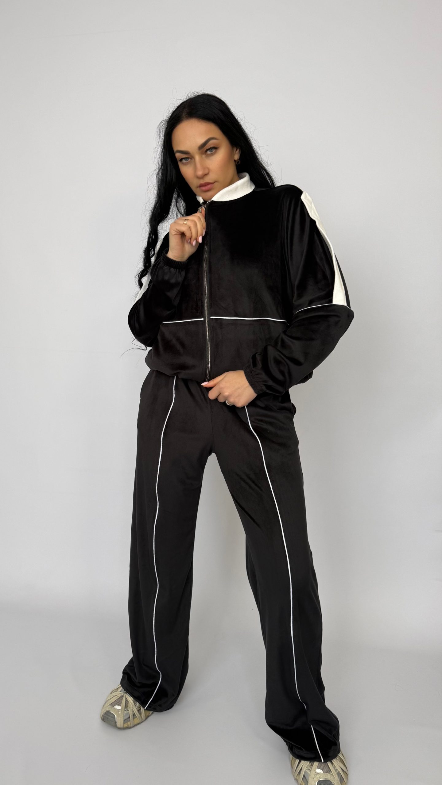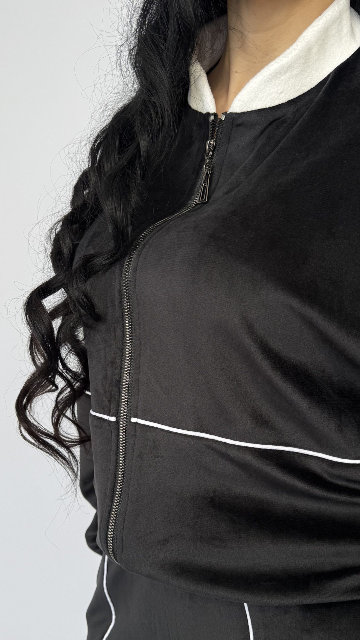 Современный спортивный костюм «Minimal»— комфорт и стиль в одной вещи. Идеален для прогулок, поездок и городских образов. Стильный дизайн: глубокий черный цвет с контрастной белой отделкой подчёркивает силуэт и делает образ графичным и универсальным. Комфортная посадка: укороченная оверсайз-куртка с удобной молнией и свободные прямые брюки создают эффект непринуждённой элегантности. Практичные детали: высокий воротник, эластичные манжеты и пояс обеспечивают тепло и удобство в носке.