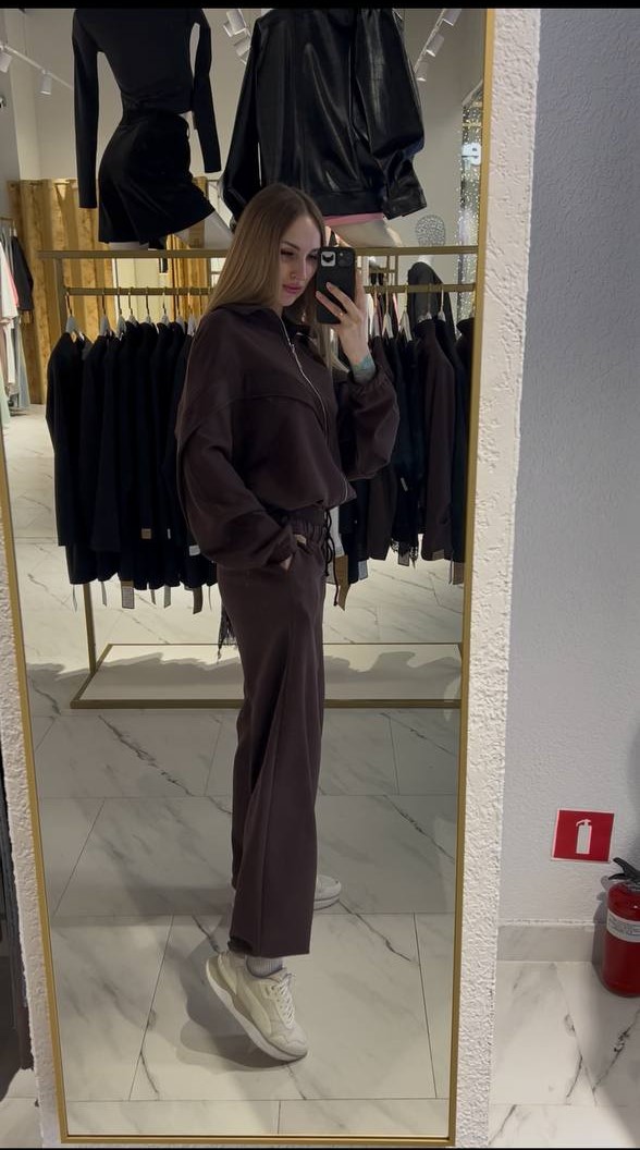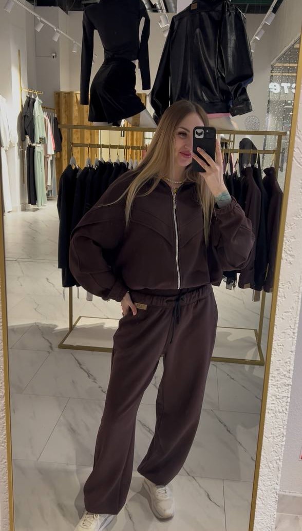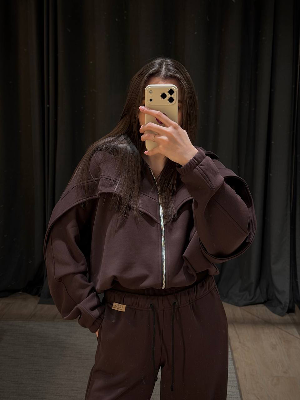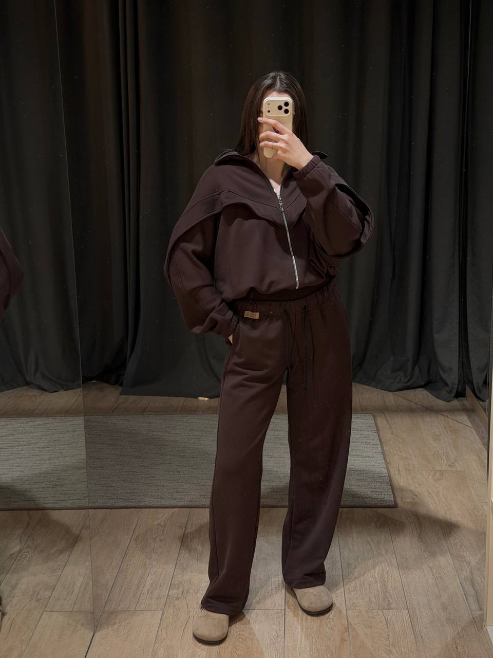 Мегаудобный и стильный костюм в глубокoм шоколадном цвете — идеальный выбор для тех, кто ценит комфорт без потери эстетики. Свитшот на молнии с объемными рукавами и аккуратными швами по груди создает модный силуэт, а свободные брюки с кулиской на талии дают полный комфорт в движении.
