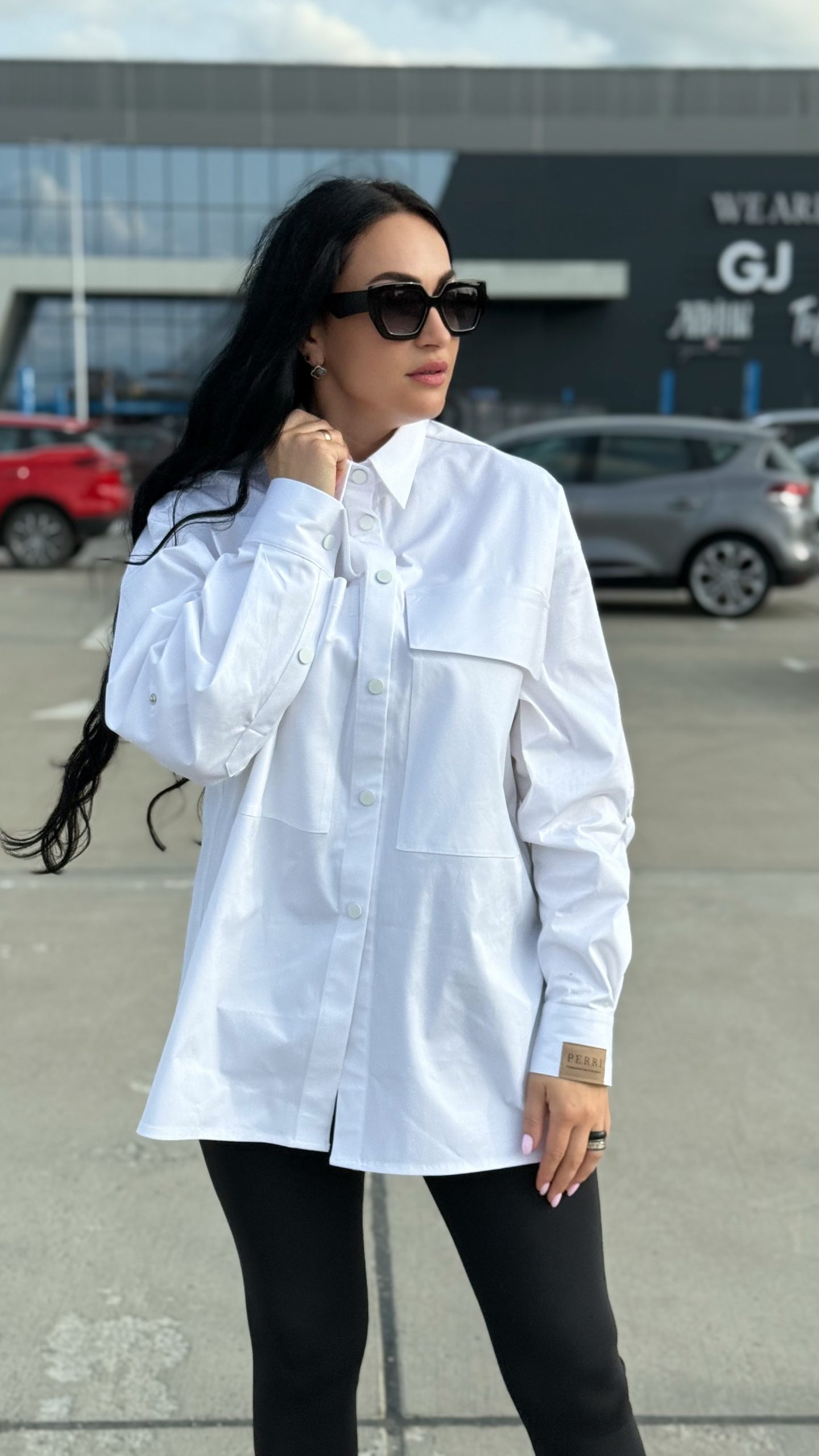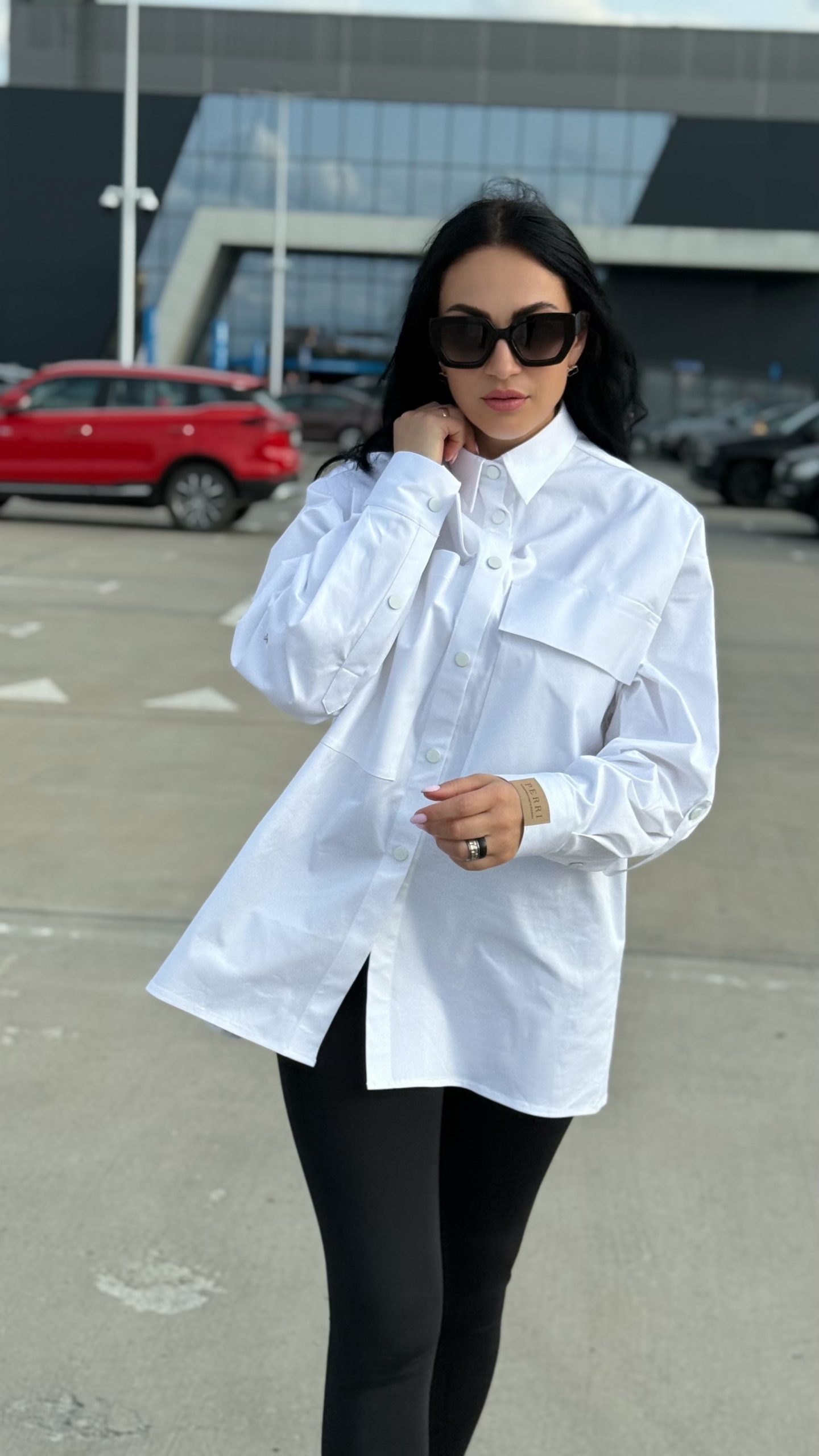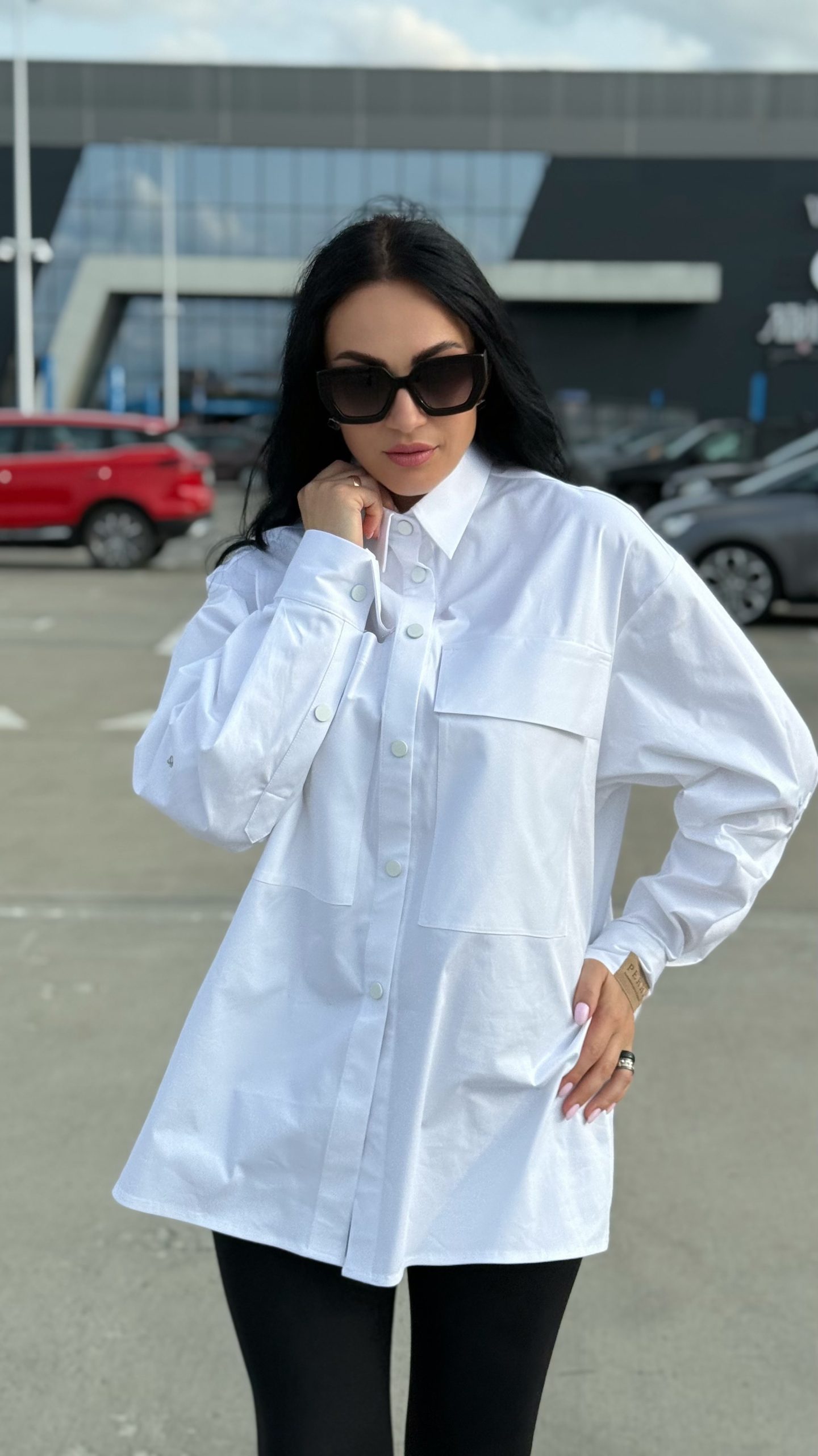 Откройте для себя идеальную белую рубашку в стиле оверсайз — лаконичная, практичная и невероятно стильная. Современный oversize-крой с четкими линиями — выглядит свежо как с джинсами, так и с брюками или юбкой. Классический воротник, большие накладные карманы спереди и заметные матовые пуговицы — минимализм с характером.