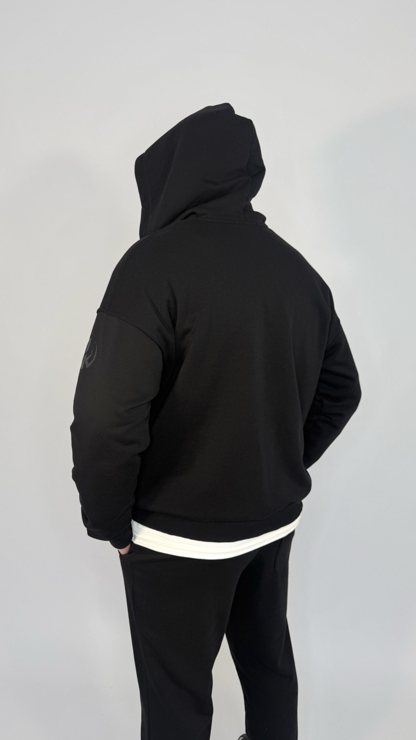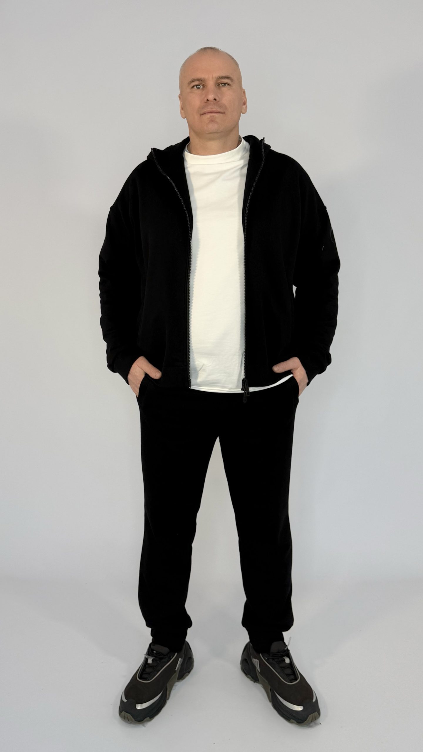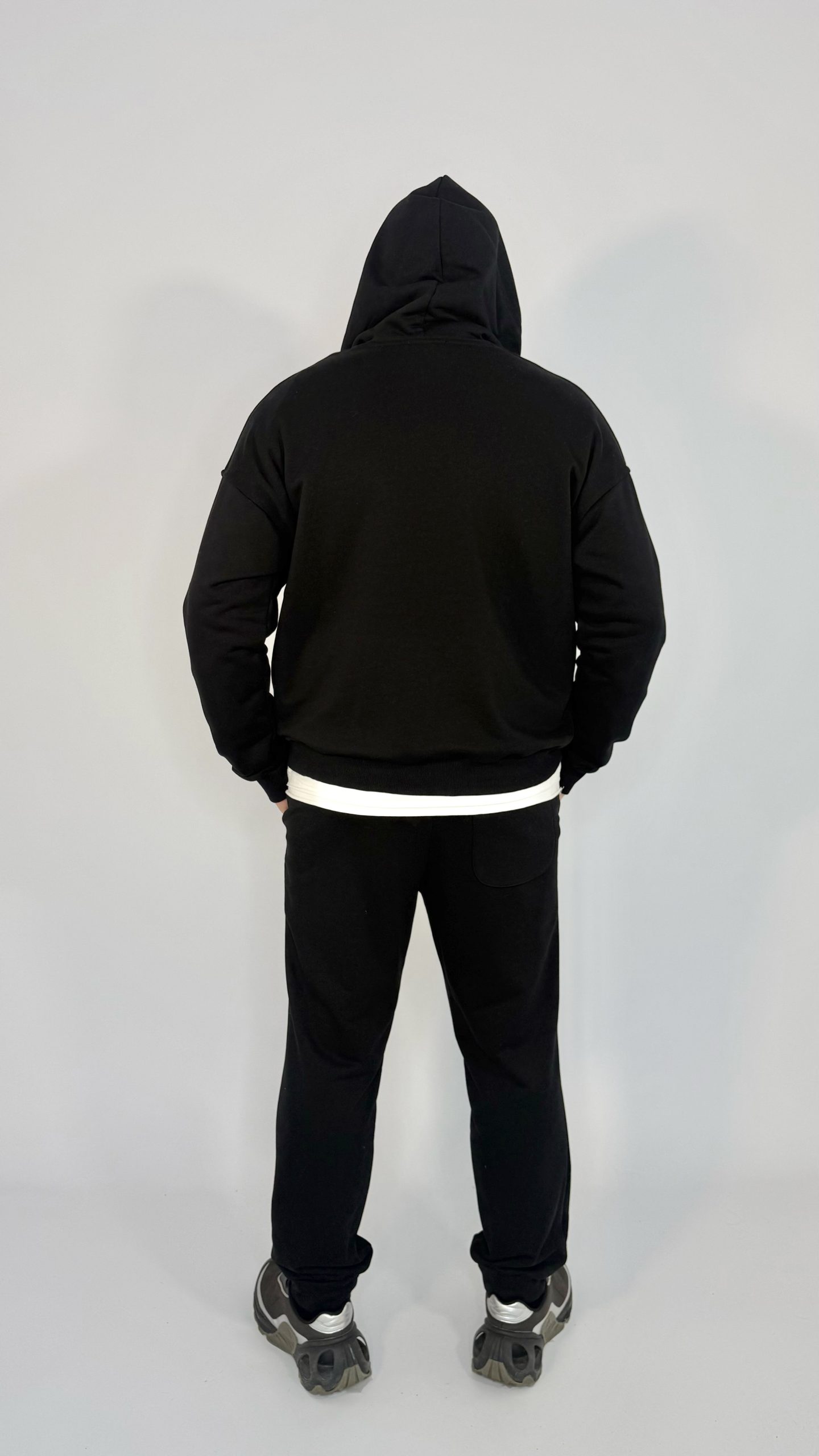 Стильный и универсальный спортивный костюм в черном цвете — идеальный выбор для тех, кто ценит комфорт без лишней вычурности. Лаконичный дизайн с центральной молнией и капюшоном легко сочетается с кроссовками и верхней одеждой, а аккуратные карманы и эластичные манжеты добавляют практичности в повседневном использовании.