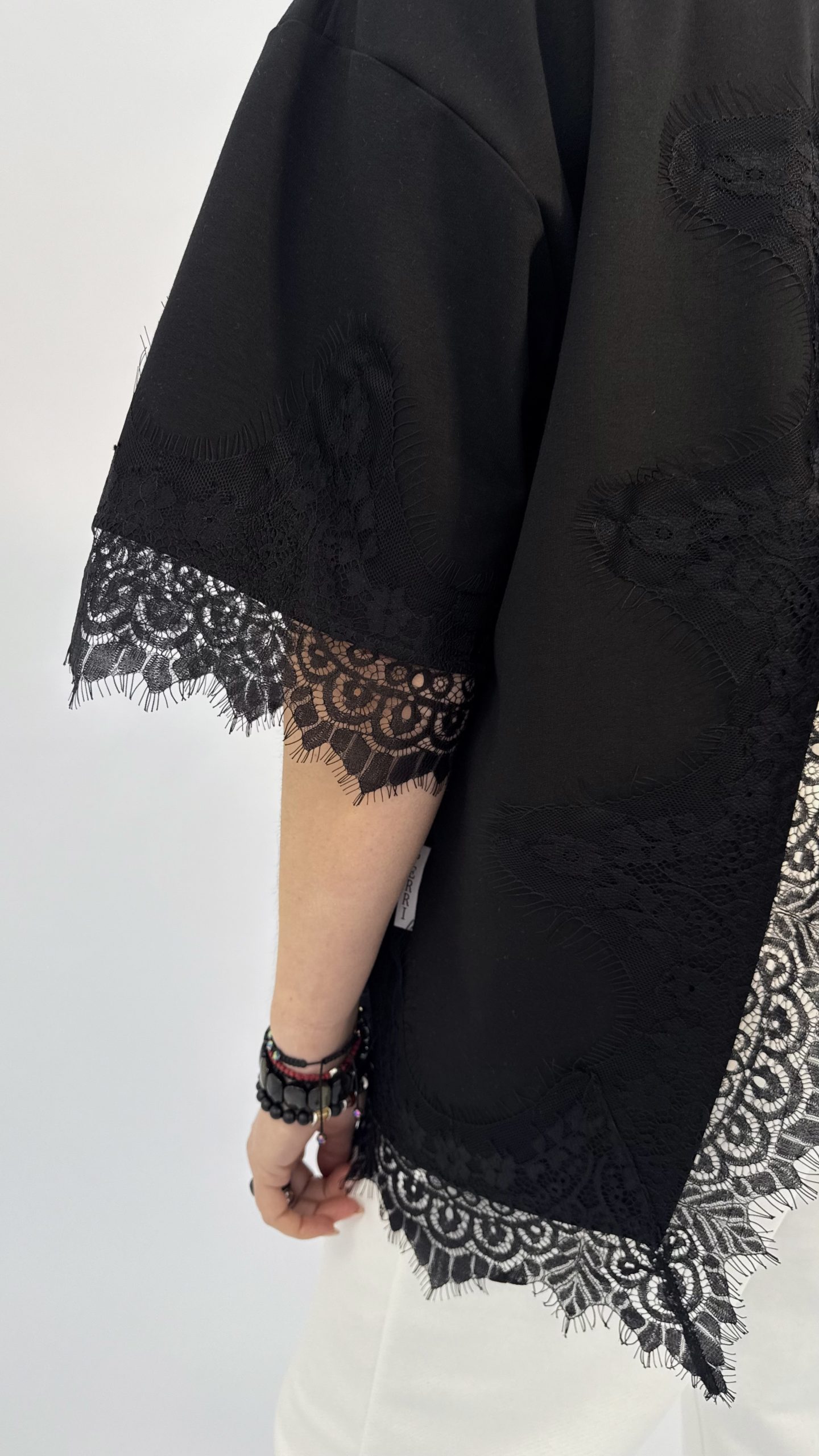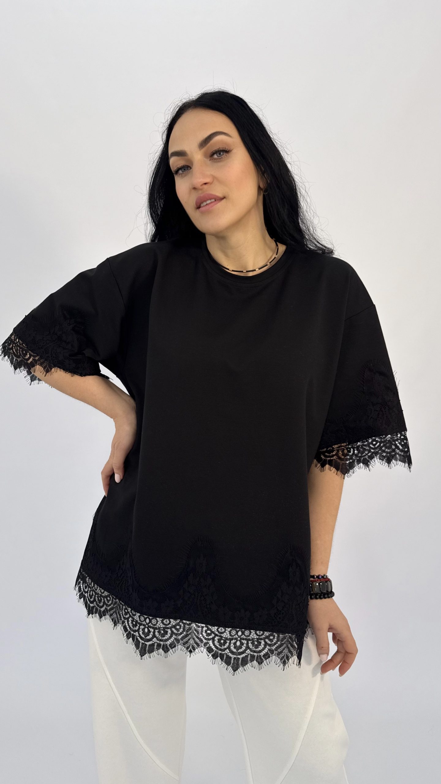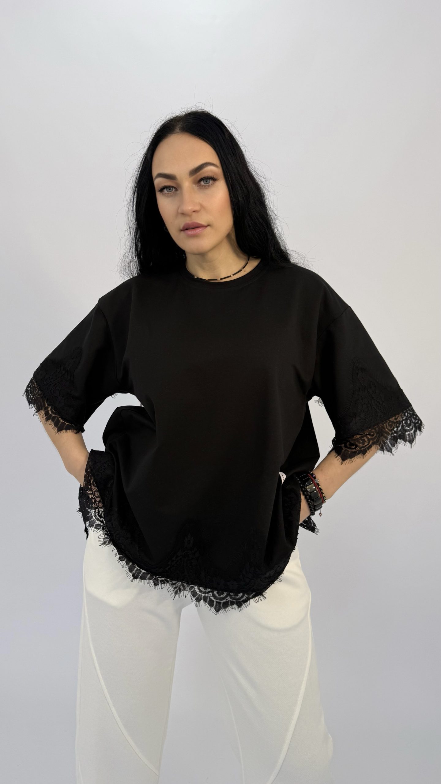 Черная футболка с кружевной отделкой — идеальное сочетание повседневного комфорта и женственной элегантности. Свободный оверсайз‑силуэт дарит свободу движений, а деликатное кружево на рукавах и по низу превращает базовую вещь в стильный акцент гардероба.