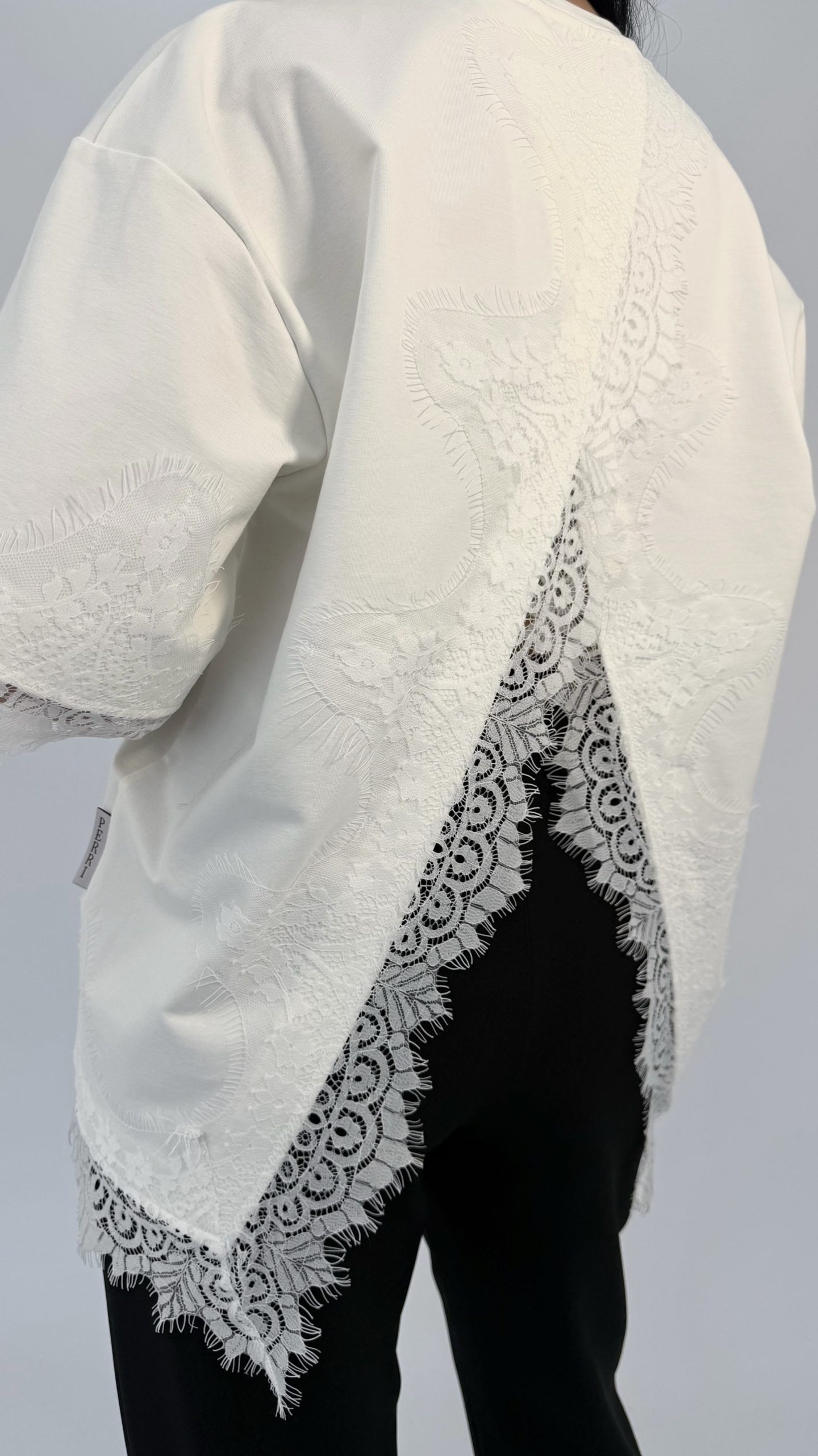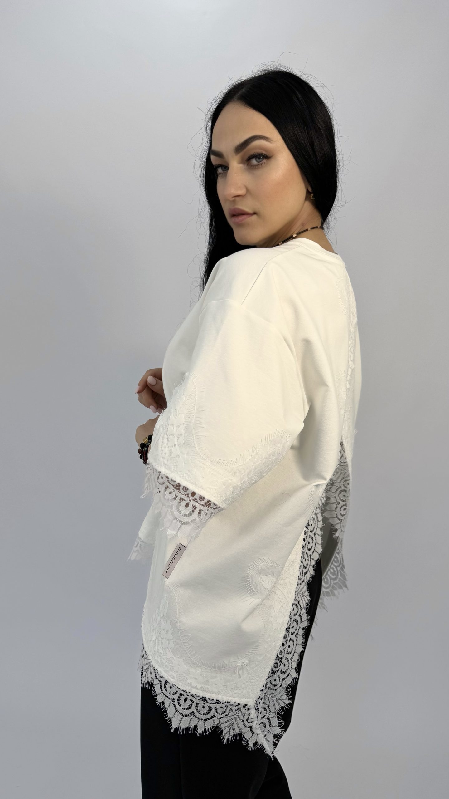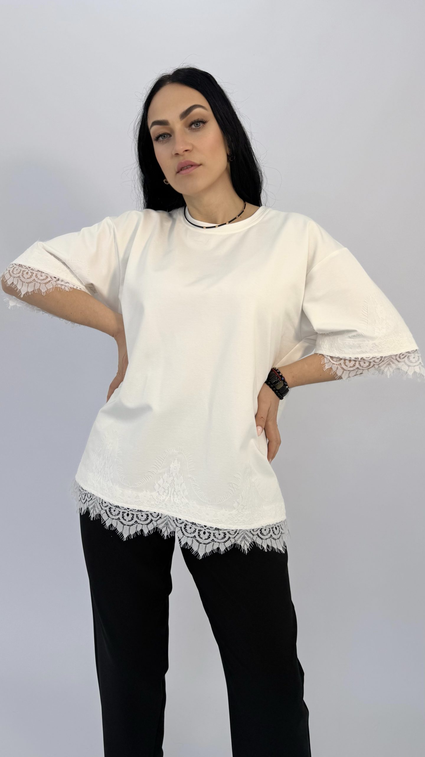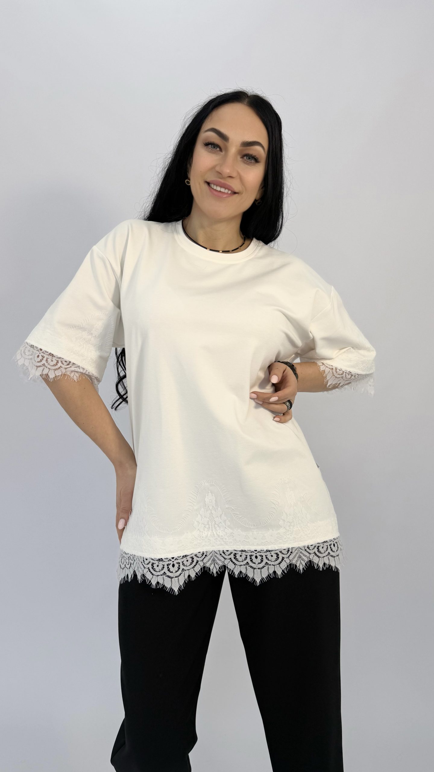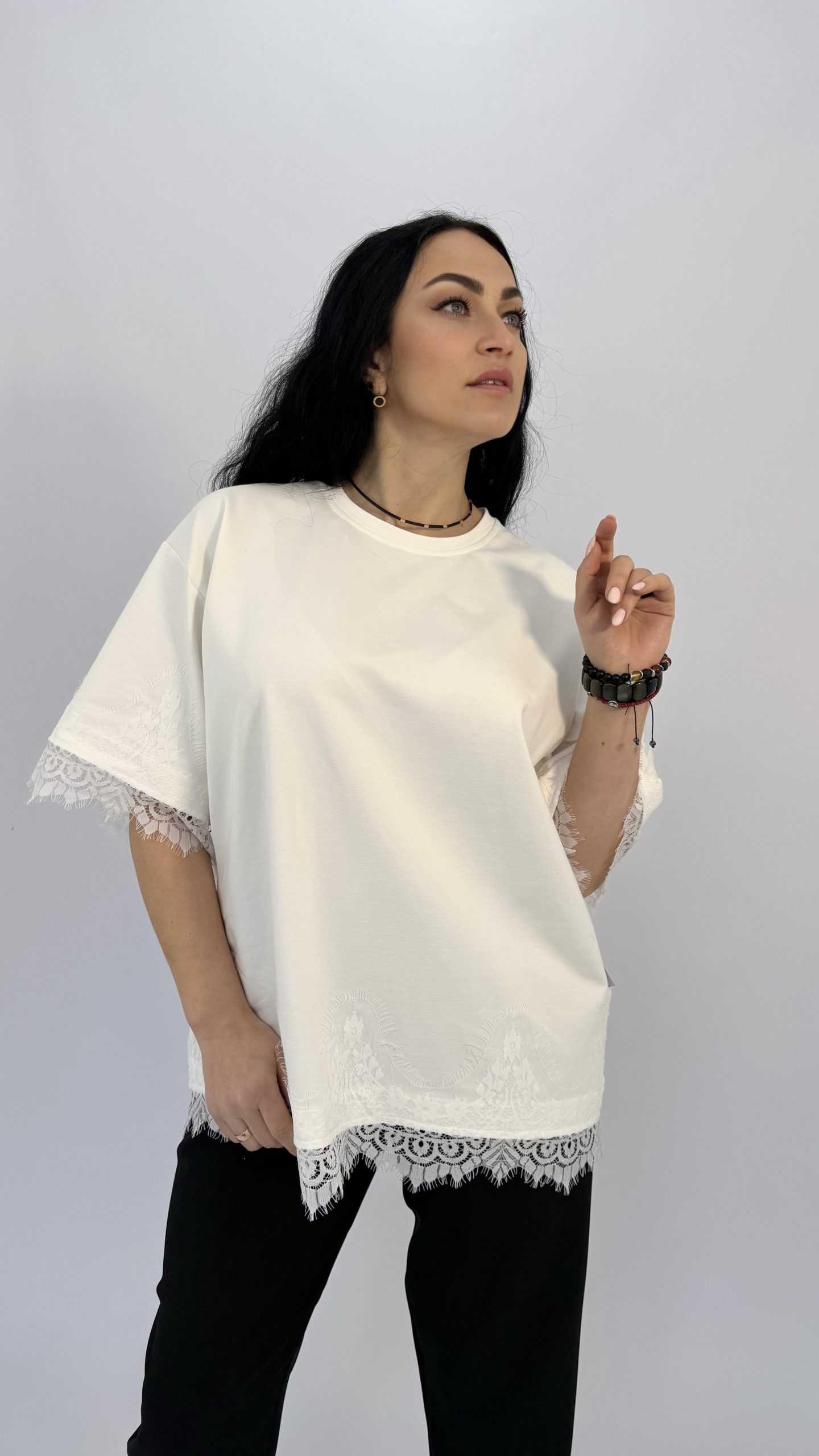 Футболка с кружевной отделкой — идеальный баланс простоты и утончённости. Лёгкий свободный крой создаёт непринуждённый силуэт, а изящные кружевные вставки по краю рукавов и низа придают образу женственности и воздушности.